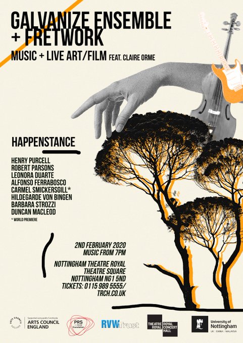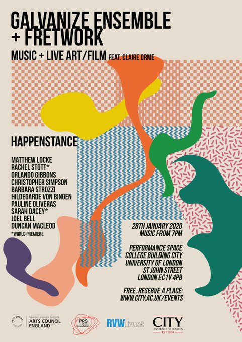 Happenstance also commissioned for Joanna Ward, Duncan MacLeod and Carmel Smickersgill, with performances at Lit & Phil Library Newcastle Upon Tyne, City University London, Cafe Oto London, with guest ensemble Fretwork viols.